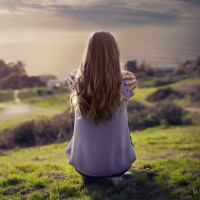 The image shows a person sitting on the grass in what appears to be