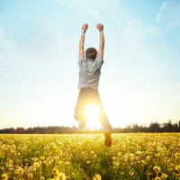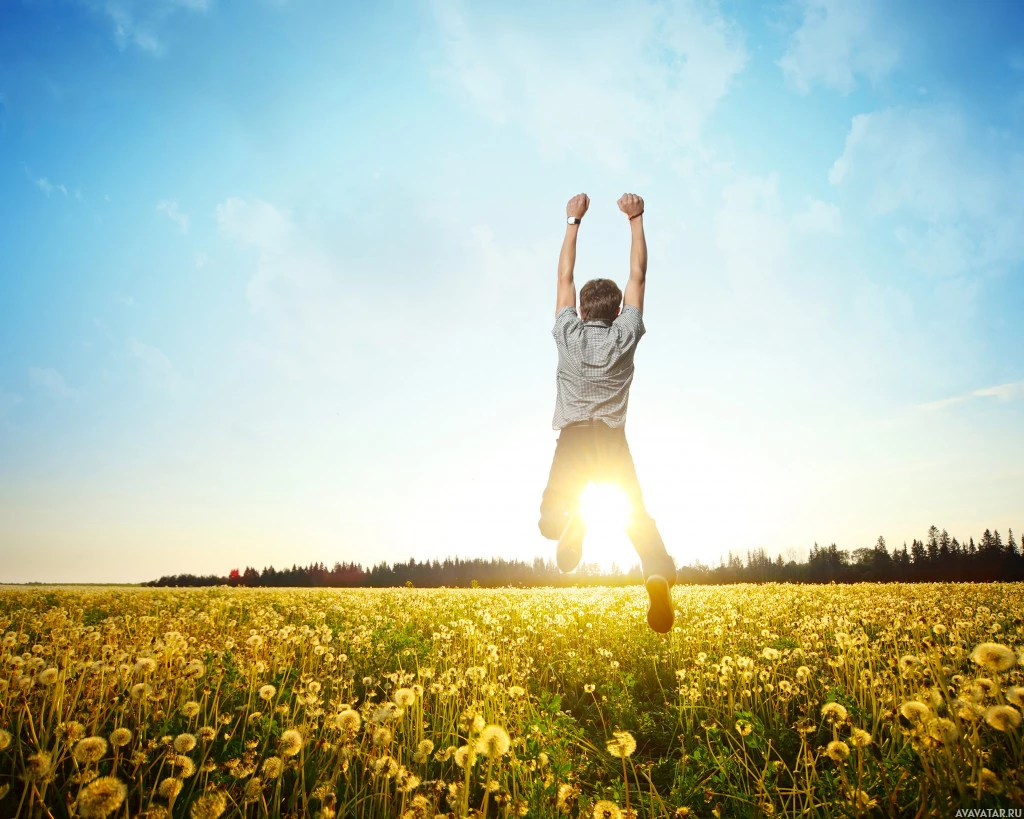 The image shows a person from behind, who appears to be a man, jumping with his arms raised in the air. He is located in an open field filled with