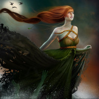 a young woman with vibrant red hair, dressed in a green dress that has a classical or fantasy style. She is depicted against a dramatic backdrop of a dark