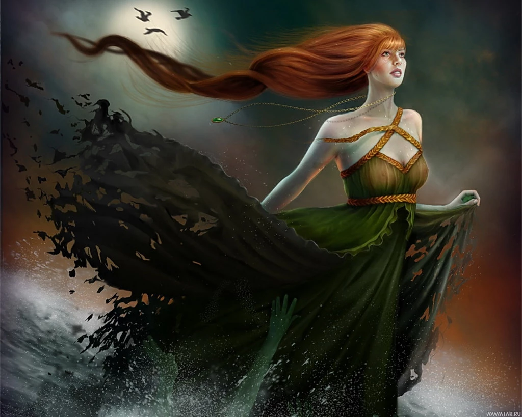 night sky with flying birds and a full moon. The overall atmosphere of the picture suggests a scene from a mythical or magical narrative. Her expression appears contemplative or perhaps distressed, as she gazes upwards towards