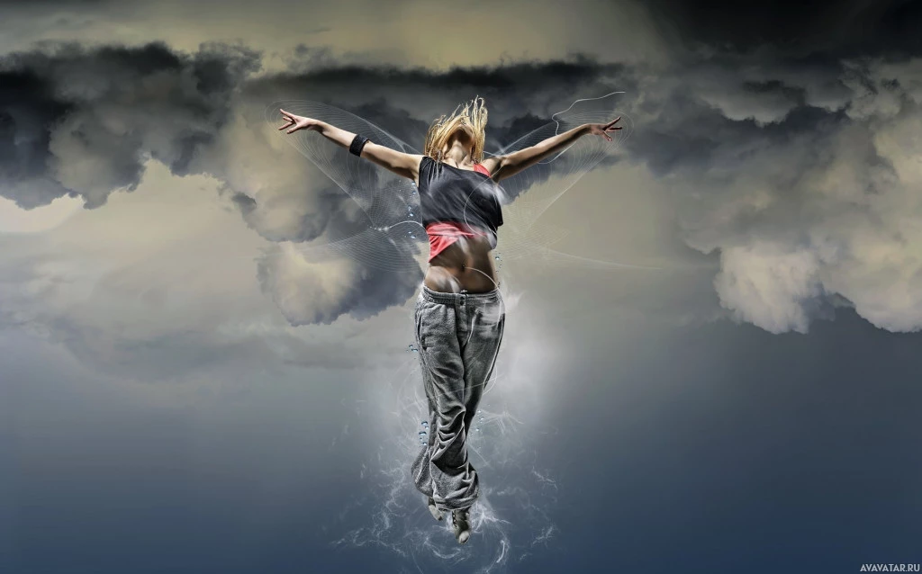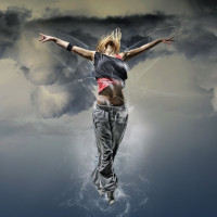 an aerial pose, as if she is floating or flying through the air. She appears to be a blonde with her arms outstretched and legs bent at the knees. Her expression seems dynamic and joyful. There are dramatic clouds and