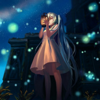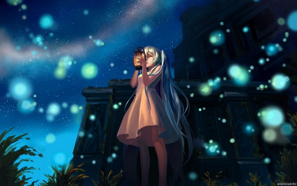blue eyes and is wearing a white dress that matches the moonlit environment around her. The background features starlight, glowing fireflies or magical sparkles, and what could be a crumbled