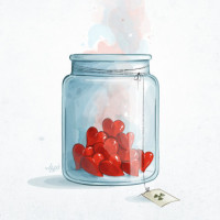 a glass jar filled with heart-shaped candies or sweets. There's also a single