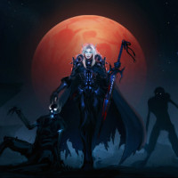 a fantasy scene featuring characters that appear to be a mix of human and zombie-like creatures, possibly suggesting a horror or dark fantasy genre. In the foreground, there is a figure dressed in what seems to be armor or a suit designed with skull motifs, which could indicate