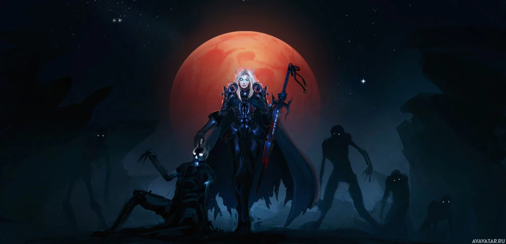 an evil character or perhaps a warrior from a world where death or the undead are prominent themes. Behind this central figure, there is another character lying on the ground, suggesting they might be injured or dead, and several other figures that resemble zombies are standing around in