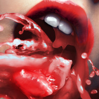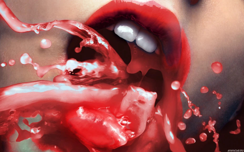 The image features a close-up of a person's lips parted slightly, suggesting that they are about to drink or have just taken a sip from something red. The background is blurred, but it appears to be