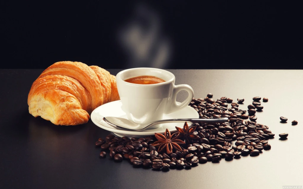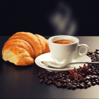 a cup of coffee, possibly containing espresso or another type of hot coffee, accompanied by a single croissant. Beside
