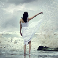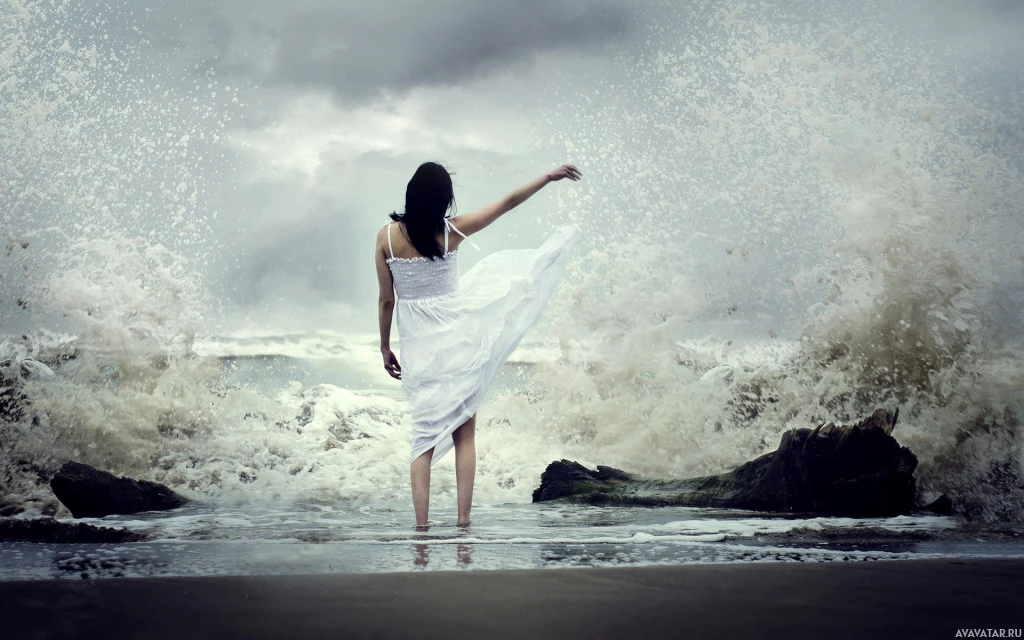 a white garment that looks like it could be a dress, and they have their arms raised with one hand touching their hair, as if in response to the wind or emotionally. The sea is depicted with waves crashing against the rocks nearby, suggesting