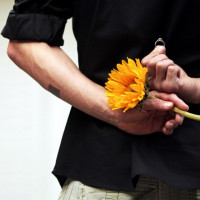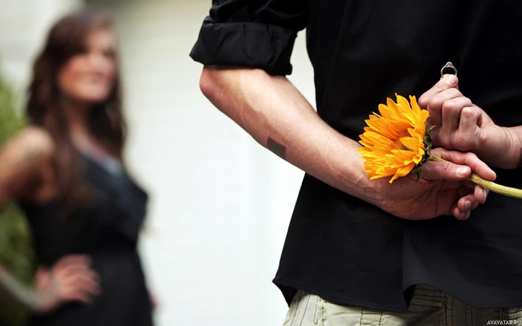 a yellow flower in one hand while his other hand seems to be grasping something out of frame. The woman is standing beside him, looking at the man with a smile. There's