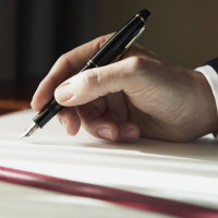 formal attire, with visible ties and possibly a suit or jacket. There is a pen being used for writing. The setting suggests