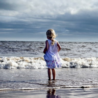 a body of water, which appears to be a beach or a coastal area with waves crashing on the shore. The child is facing away from the camera and seems to be looking out towards the sea. The setting looks like it could be early morning or late afternoon due to