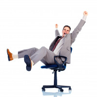 The image shows a person in a business suit, with their arms raised in the air and a broad smile on their face. They appear to be celebrating or expressing joy. This individual is sitting on a computer chair within an office environment.