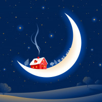 a full moon that is split into two halves, and in between these halves, there's a small house with smoke coming out of its chimney. This creates the illusion that the moon has been cut to accommodate the house within it. The background features stars twinkling in