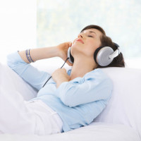 The image shows a woman lying on her back with her eyes closed. She appears to be resting or sleeping, and there are headphones around her neck, suggesting she might be listening to music or an audiobook while she relaxes. Her expression is peaceful and content.