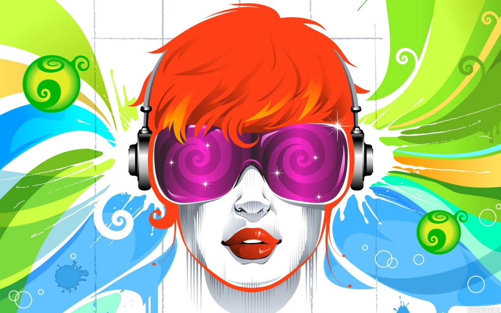 red hair, wearing sunglasses and headphones. Her image is set against a colorful,
