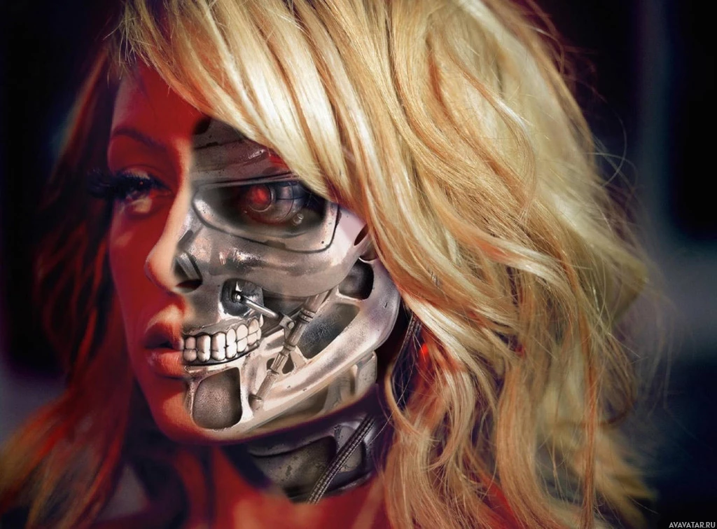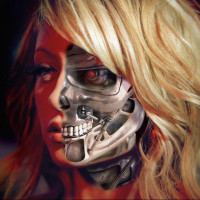 science fiction themes, as it appears to merge human features with those of robots or technology. The overall effect is somewhat striking and might suggest themes related to artificial intelligence, robotics, or cybernetic enhancements in popular culture such as movies, video games, or futuristic