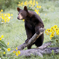 yellow flowers, which appear to be sunflowers. The bear is in an upright position with all four