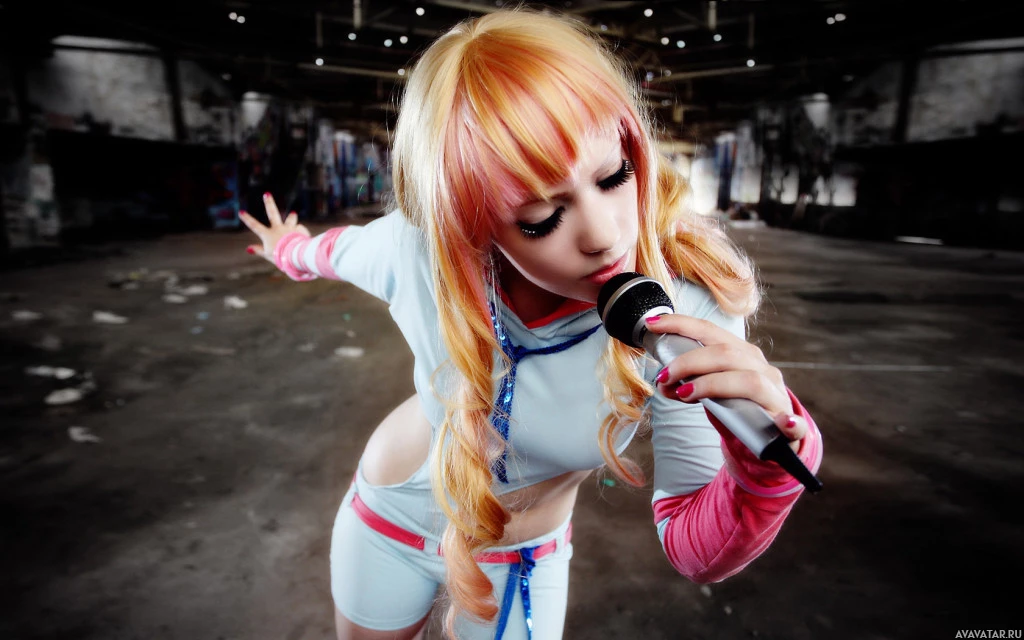 red hair and is dressed in a colorful outfit that appears to be inspired by a character's costume. They are holding a microphone, suggesting they might be participating in a singing contest or performance related to