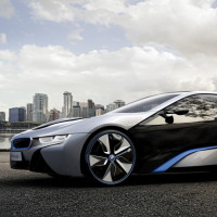 The image shows a futuristic-looking car, specifically the BMW i8, which is known for its aerodynamic design and