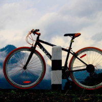 На картинке изображен велосипед, опирающийся на то, что кажется деревянным столбом или забором, на фоне горного пейзажа. Кажется, что его можно было взять в поездку или во время езды на велосипеде по живописной местности.