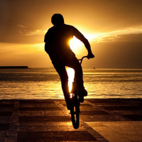 The image depicts a silhouette of a man riding a bicycle along the edge of a body of water, likely at sunset given the warm and golden lighting. The setting appears serene with calm waters reflecting the sky. The man is captured in mid-motion, suggesting movement and activity against the tranquil backdrop.