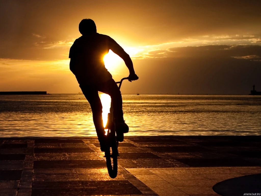 На картинке изображен силуэт человека, едущего на велосипеде по краю водоема, вероятно, на закате, учитывая теплое и золотое освещение. Помещение кажется безмятежным со спокойными водами, отражающими небо. Человек захвачен в середине движения, предлагая движение и активность на спокойном фоне.