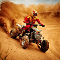 sandy terrain, possibly during an off-road racing event. There is visible dust being kicked up by the vehicle, indicating