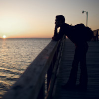The image features a silhouette of a person standing on what appears to be a dock or pier. The individual is looking out over the water, which suggests they are contemplating something or simply enjoying the view at either sunrise or sunset given the warm tones in the sky. There's no specific information about the location or the nature of the person's thoughts from this image alone.