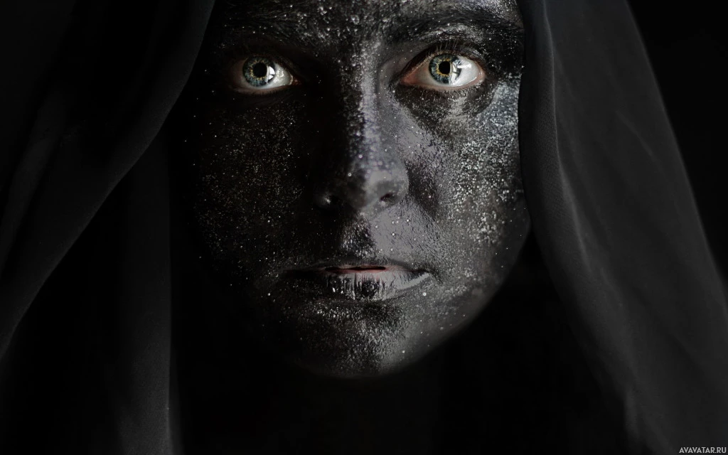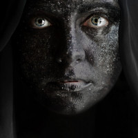 The image shows a person with their face painted or adorned in some manner, possibly for theatrical or artistic purposes. The individual appears to be looking directly at the camera, and there is a dramatic
