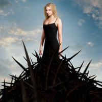 thorny branches or brambles. She is wearing a sleeveless dress and has