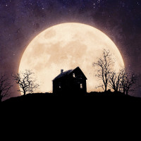 The image shows a silhouette of a house under the full moon at night. There are bare trees around the house, suggesting it might be autumn or winter. The sky is dark with stars visible, contributing to the nocturnal ambiance.