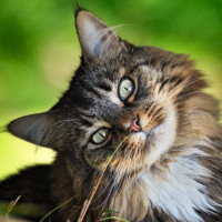 a striped pattern typical of domestic shorthair cats. It appears to be in a natural