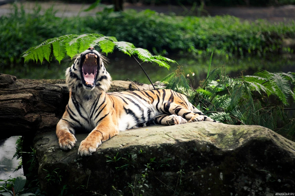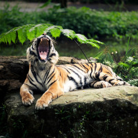 a natural environment, possibly a zoo enclosure or a protected area where the tiger can roam and exhibit behaviors more characteristic of the wild. There are green plants, rocks, and water visible around the tiger, providing it with a habitat that mimics its
