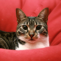 На картинке изображена табби-кошка, лежащая на боку. Мех кошки представляет собой смесь черных и серых полос. У него широко открытые глаза, смотрящие в сторону камеры, что придает ему несколько удивленное или любопытное выражение. Кошка отдыхает в мягкой красной подушке или одеяле, обеспечивая ей удобное место для отдыха.