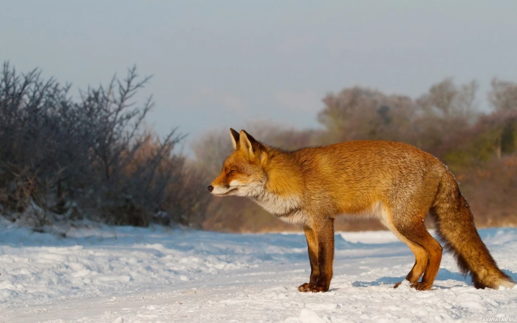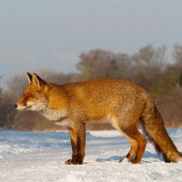 На картине красная лиса стоит на том, что кажется заснеженной землей. Лиса имеет уши, протянутые вперед, и, кажется, смотрит на что-то вдалеке. Это изображение может быть связано с дикой природой или природой, особенно с одним животным в его естественной среде обитания в зимних условиях.