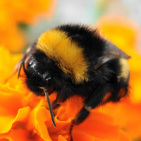 The image shows a bee with yellow and black stripes, which is characteristic of the European honeybee (Apis mellifera). It's perched on orange flowers, possibly marigolds or other similar species. There are no bumblebees visible in this picture.