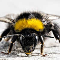 color pattern which is characteristic of many types of bees. The bee appears to be resting on a surface that could be a rock or pavement. This type of insect belongs to the family Apidae and plays