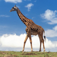 grassy terrain. The sky is clear with some clouds scattered in the distance. The giraffe is facing towards the viewer, and its