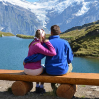 majestic mountains with snow-capped peaks and a serene lake. The weather appears to be clear and sunny. There is also some foliage visible near the bench where the couple is seated. The person in the image is wearing