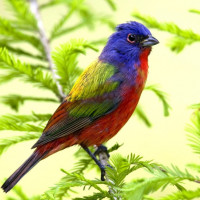 blue plumage and bright colors including red, yellow, orange, white, and black markings on its wings. The bird appears to be alert or attentive.