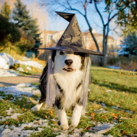 a witch hat on its head, which adds a humorous and playful touch to the scene. It appears that someone has placed the witch hat on the dog for fun or possibly for