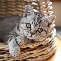 На снимке изображен маленький серый и белый котенок. Похоже, что он удобно отдыхает в плетеной корзине, которая обычно используется в качестве кровати или спальной зоны для домашних животных, таких как кошки. Котенок имеет несколько озадаченное или любопытное выражение на лице.