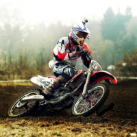 recent rain or damp conditions, and the rider seems to be in motion, possibly racing or performing stunts. The setting appears to be outdoors during