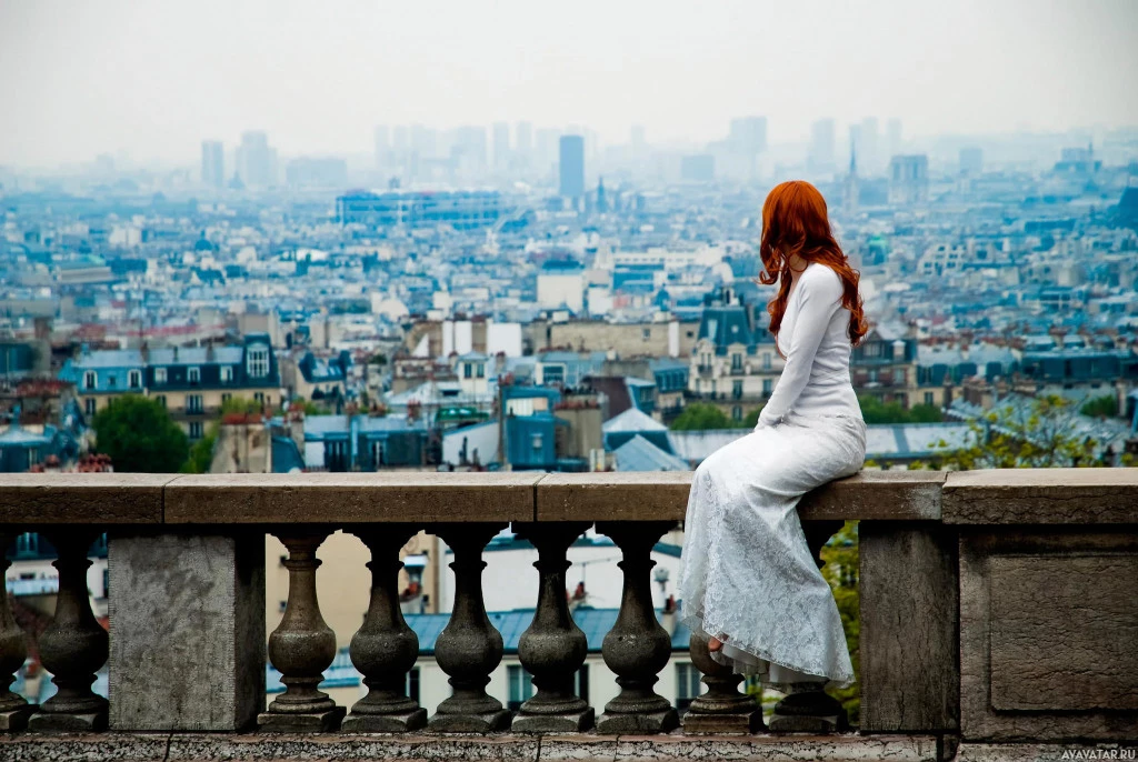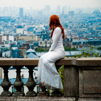 a stone railing or parapet, looking out over a cityscape. She appears to be in a dress and has
