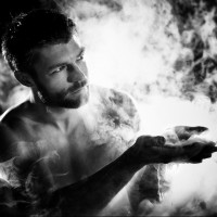 The image shows a man sitting in front of smoke or possibly a fire. He appears to be holding an object near the source of the smoke or flames, creating a dramatic effect around him due to the contrast between the illuminated area and the dark surroundings. There are also what seem to be particles or sparks emanating from the source of light, which adds to the overall intensity of the scene.