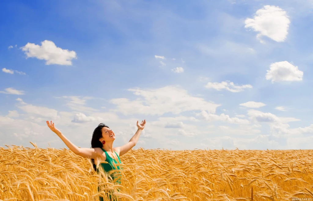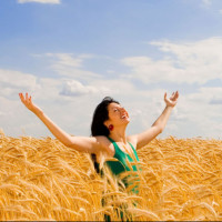 an open field. She appears to be brunette and she has her arms raised towards the sky, which might suggest that she's expressing joy or singing. The environment around her looks like it could be in late summer or early fall, given the color of the grass and crops, which are likely harvested