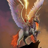 an animated character riding a unicorn, which is often referred to as a "pegasus" in mythology. The character appears to be depicted in