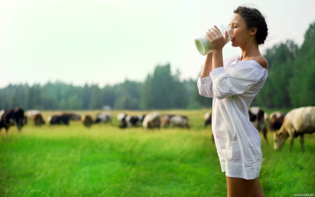 a young woman standing in an open field, drinking from a cup. She appears to be enjoying her drink while surrounded by nature and the tranquility of the outdoors. There are cows grazing in the background, suggesting this could be