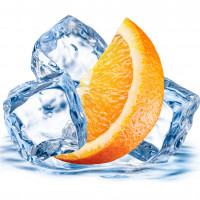 На картинке изображен оранжевый ломтик, окруженный кубиками льда. Это творческое представление освежающего напитка, возможно, ледяного лимонада или холодного фруктового сока.