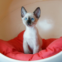 blue eyes and a light-colored fur with darker areas on its face, ears, paws, and tail. It appears to be looking upwards or towards the camera, displaying curiosity or alertness. The background is neutral and does not distract from the focus on the kitten.
